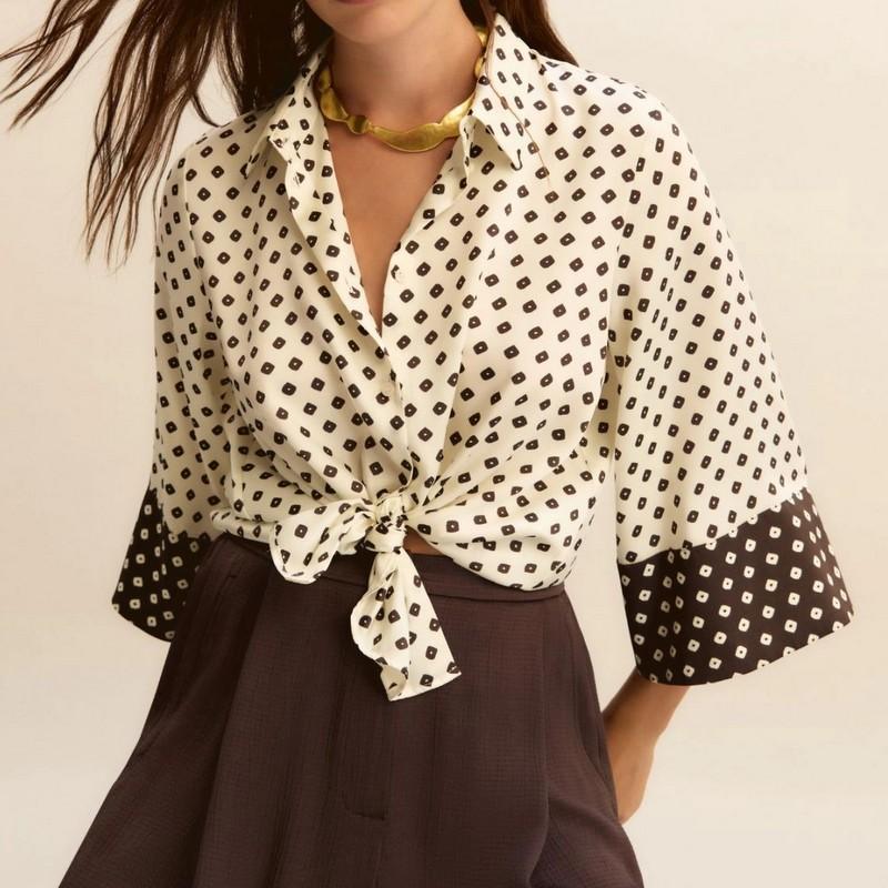 Collo a camicia con manica a tre quarti.