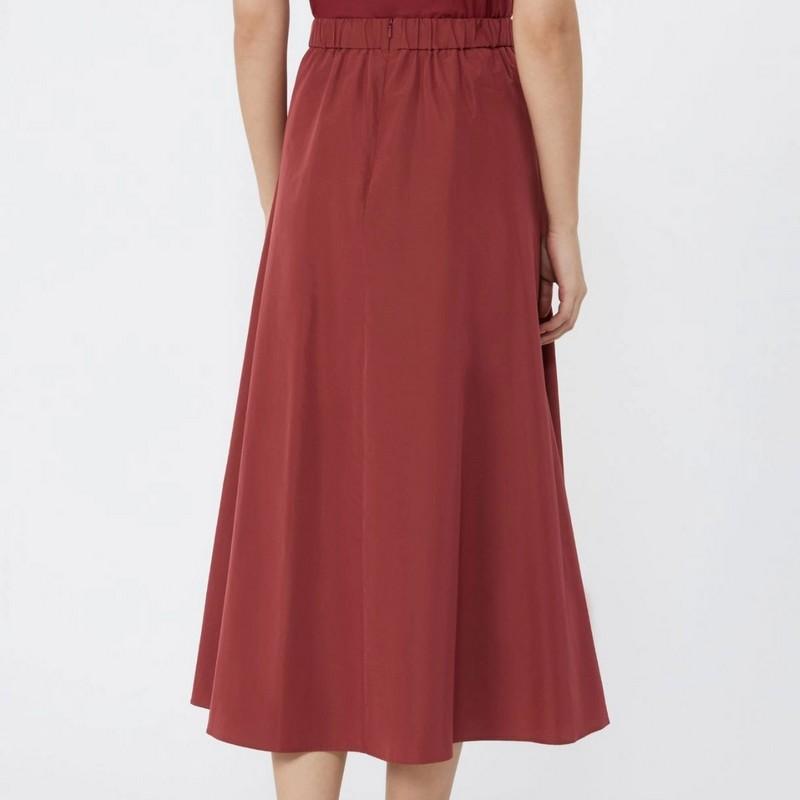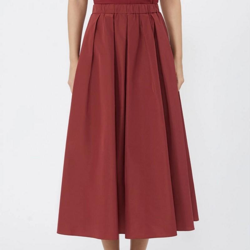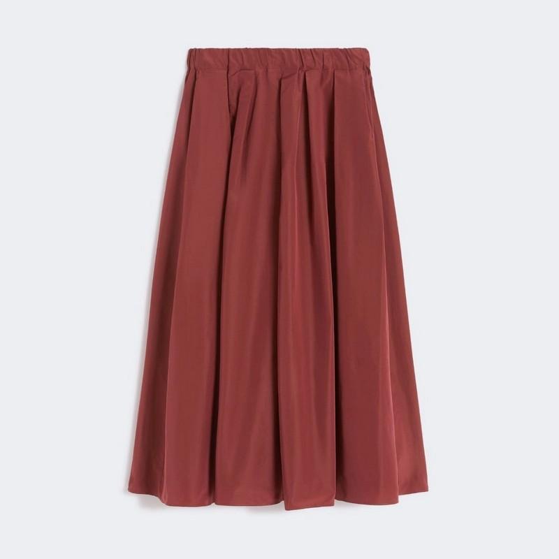 Gonna lunga, color ciliegia, dal volume ampio con pieghe cucite in vita sul davanti.