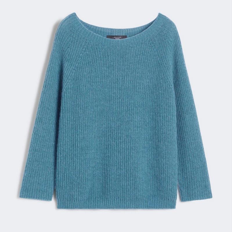 Maglia petrolio in filato mohair con lavorazione a punto pannocchia.