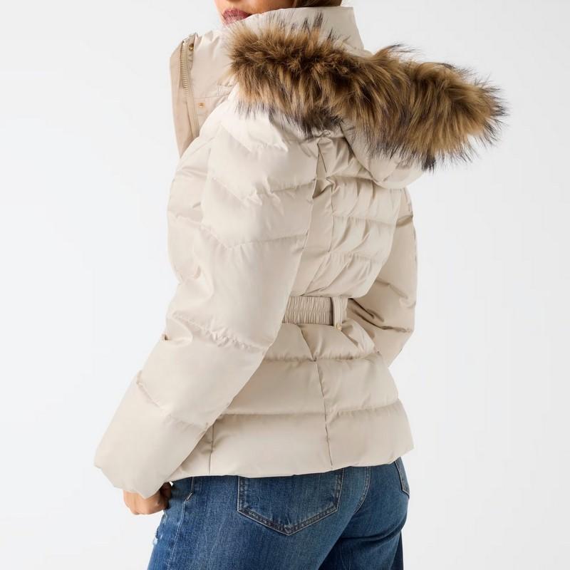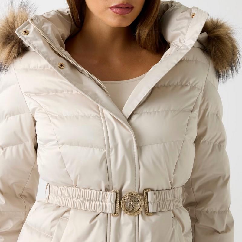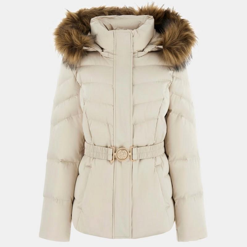 Cappuccio con finiture in pelliccia sintetica e manica lunga.